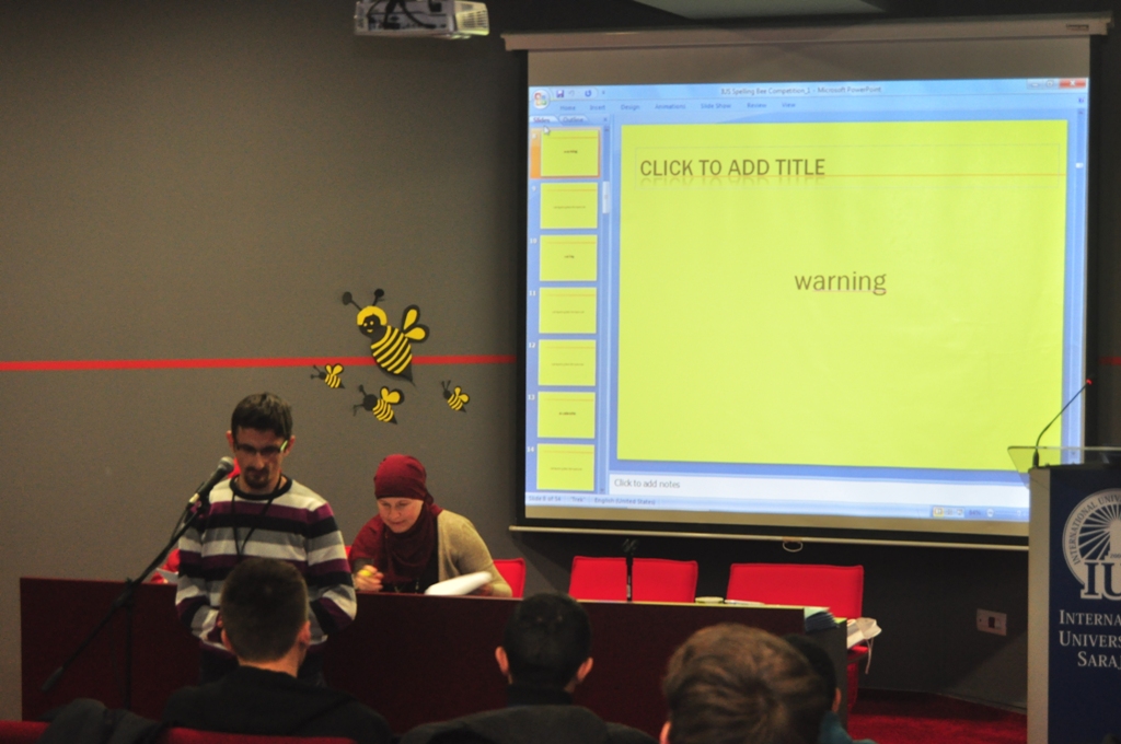 The 1st IUS Spelling Bee competition was held on 24 December 2014. The competition was organized by English Language and Literature study program. All students of Freshman English course were eligible to participate and earn extra credit for the course. Out of 26 students who registered, 19 students took part in the competition demonstrating a high level of English proficiency and rich vocabulary. Contestants were enthusiastic in spelling a variety of different words, including: avalanche, tenacity, futile, bedlam, engender, mire, buoy, viscous, rapport, etc.